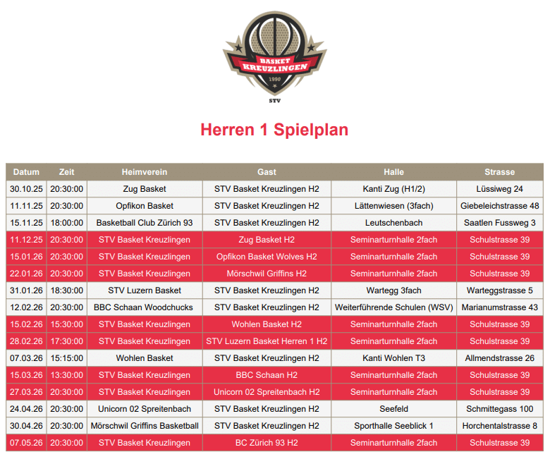 | 1 | STV Luzern Basket Herren 1 H2 | 4 | 4 | 0 | 344 | 278 | +66 | 8 |
